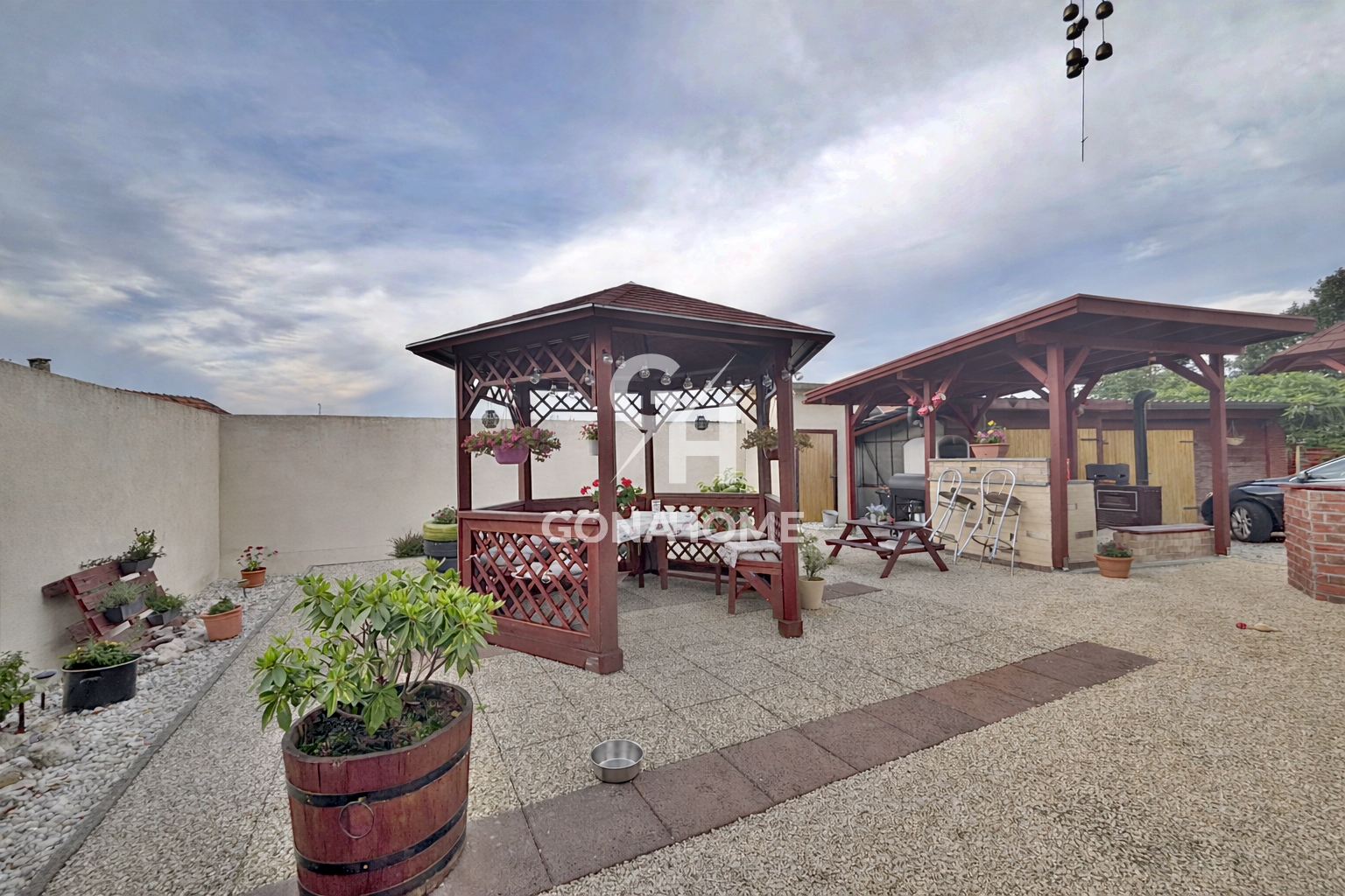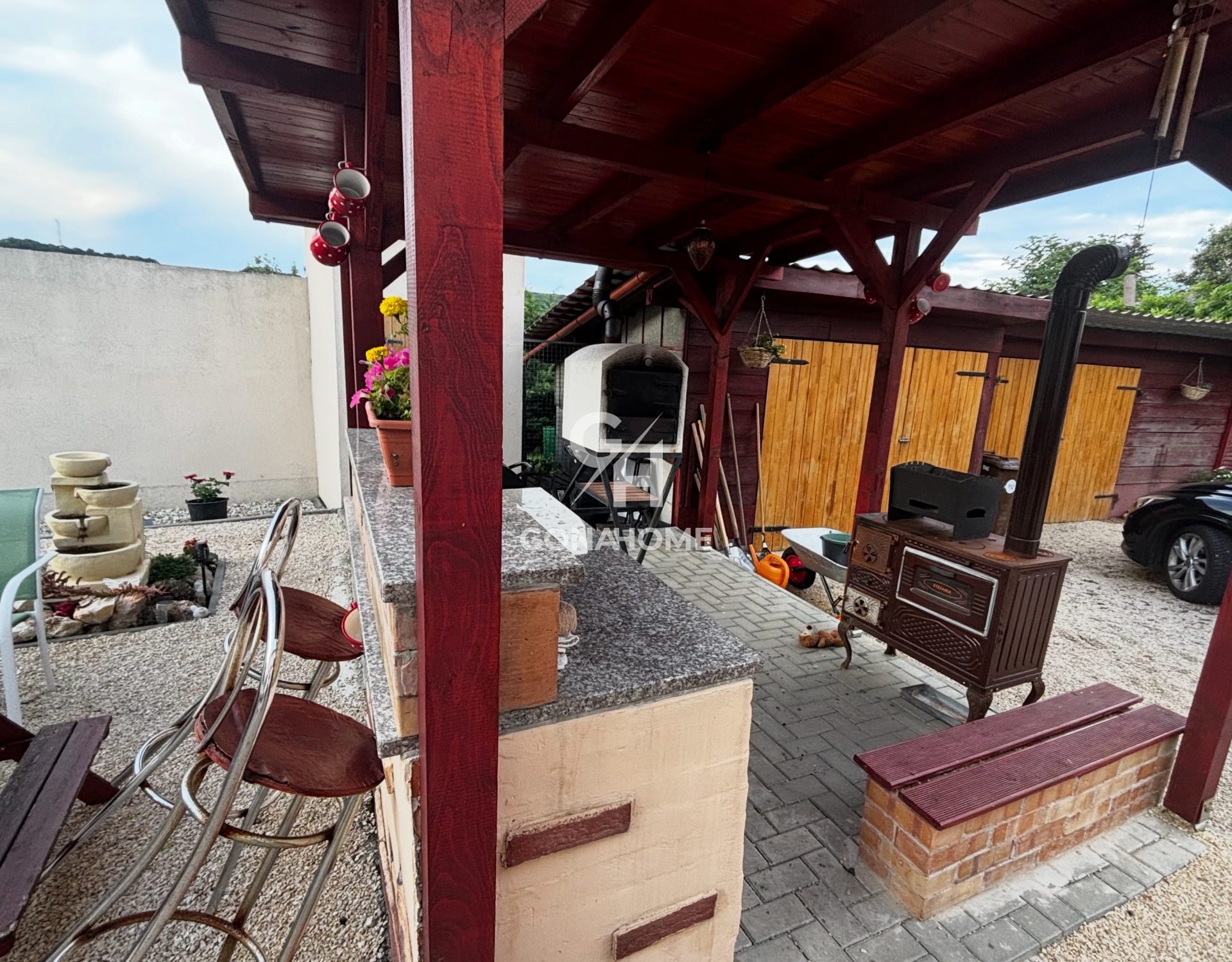 - A telken található 2 tároló, mely 2 garázsként is funkcionálhat, 2 kerti csap, fúrt kút, mini kemence, sparhelt