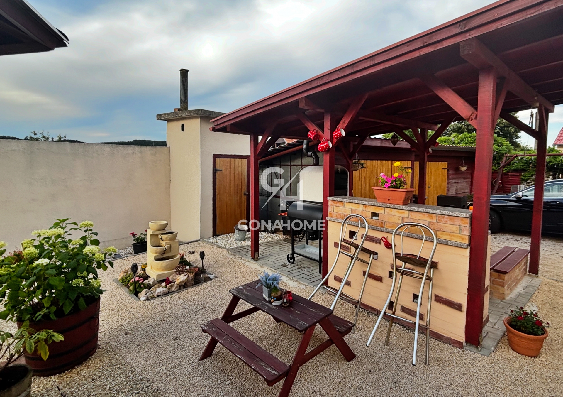 A kert praktikusan felszerelt: kialakításra került 2 kerti csap, valamint egy fúrt kút, amely vízkiemeléses szivattyúval működtethető, így az öntözés és az állattartás vízellátása költséghatékonyan megoldható. A hangulatos mini kemence és sparhelt a vidéki életérzést és az önellátó életmód lehetőségét erősíti.