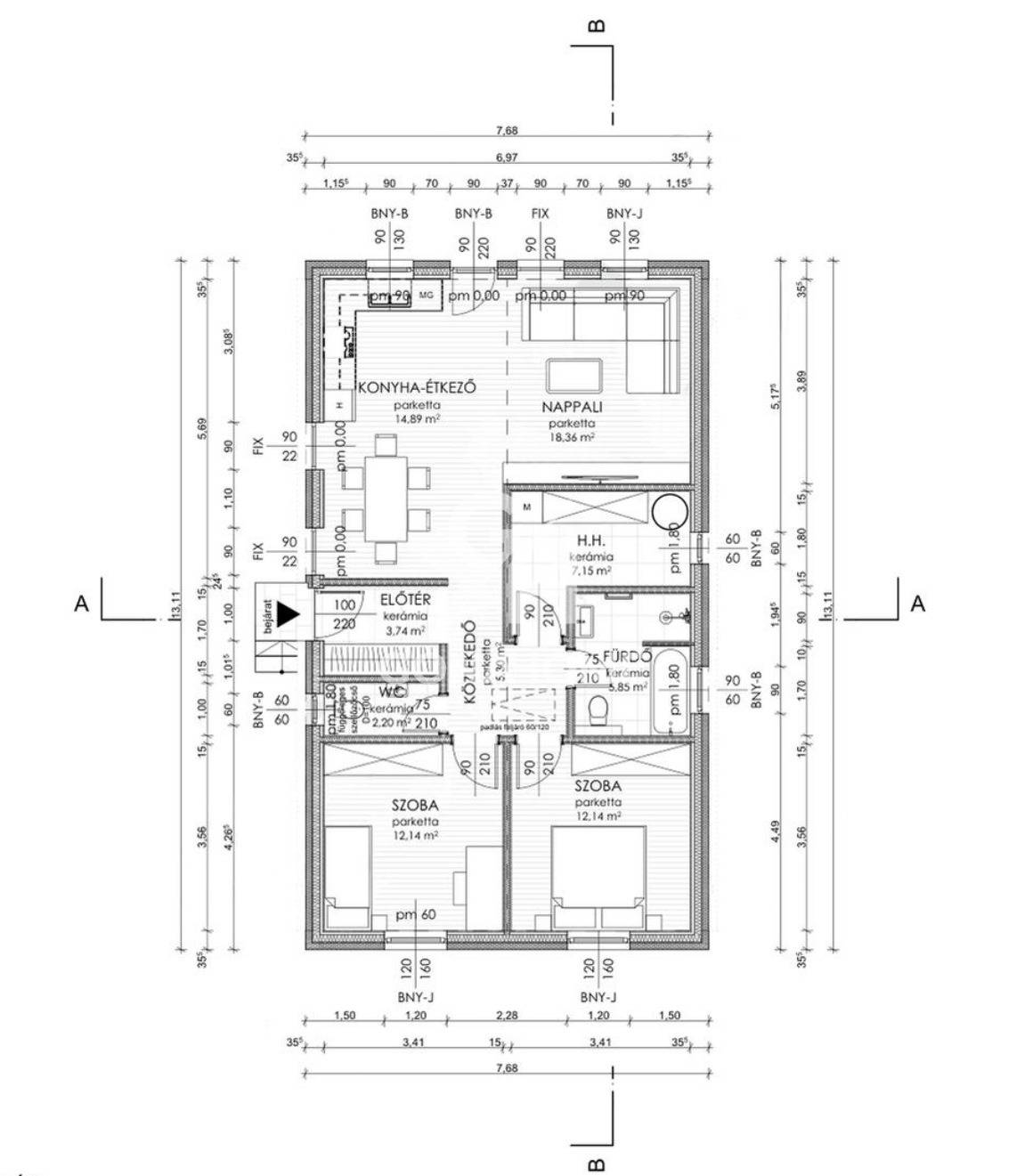 - Konyha-étkező: 14,89 m2