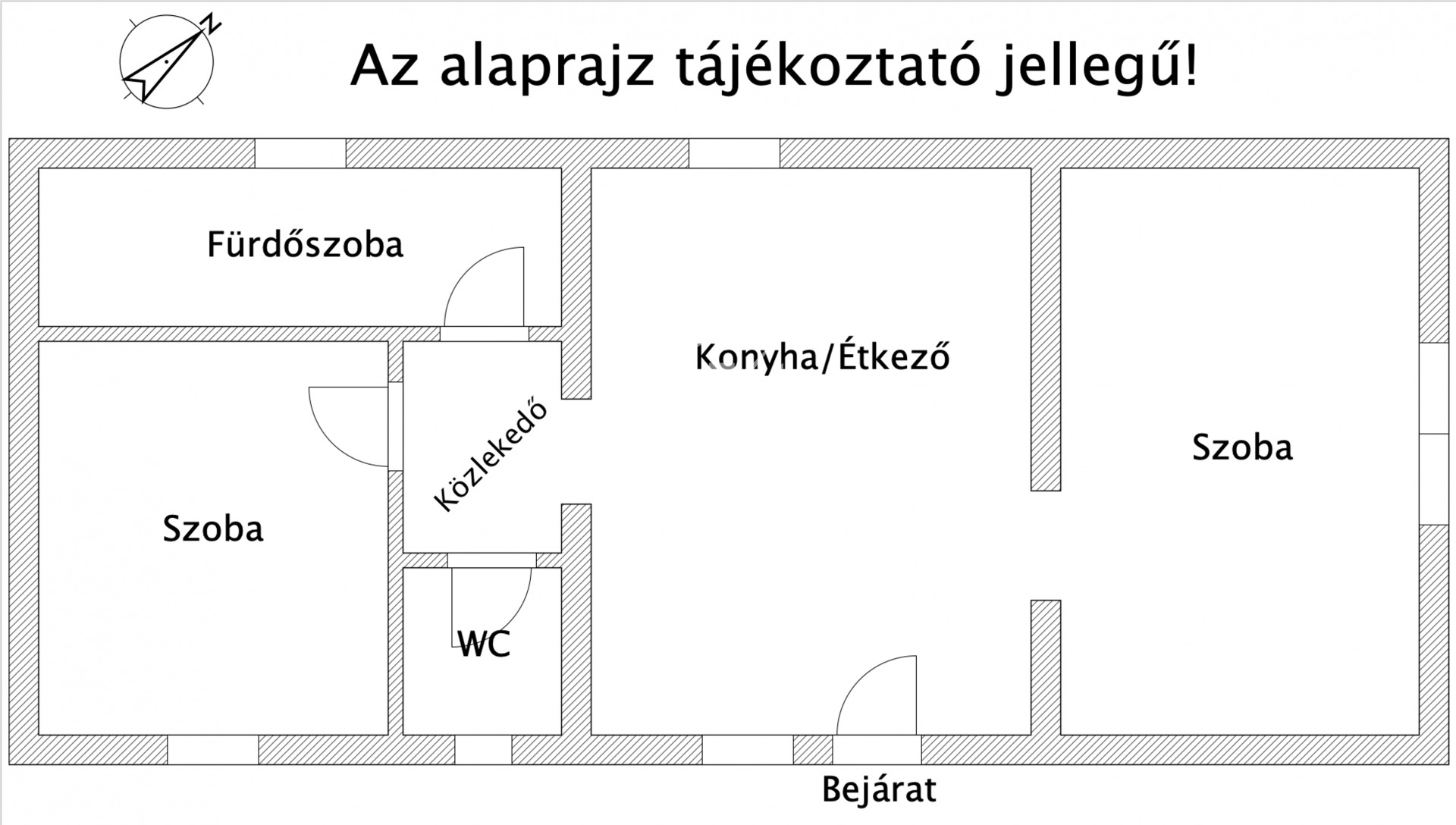- Az egy szintes ingatlanba található: előszoba/konyha/étkező, 2 szoba, fürdőszoba, WC