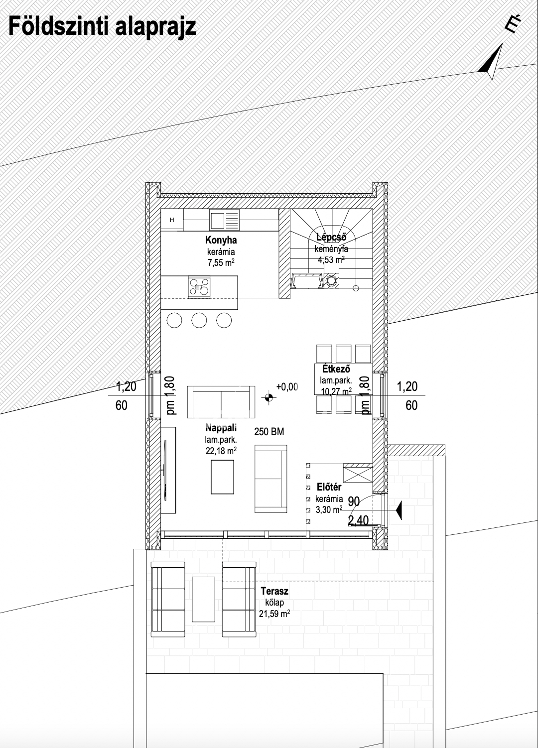 Az ajtón belépve egy kis ELŐSZOBA és cipős szekrény kapna kialakítást. A NAPPALIT csak egy fa oszlopsor választja el, hogy az üvegfelület felől minél kisebb legyen az árnyékolás.