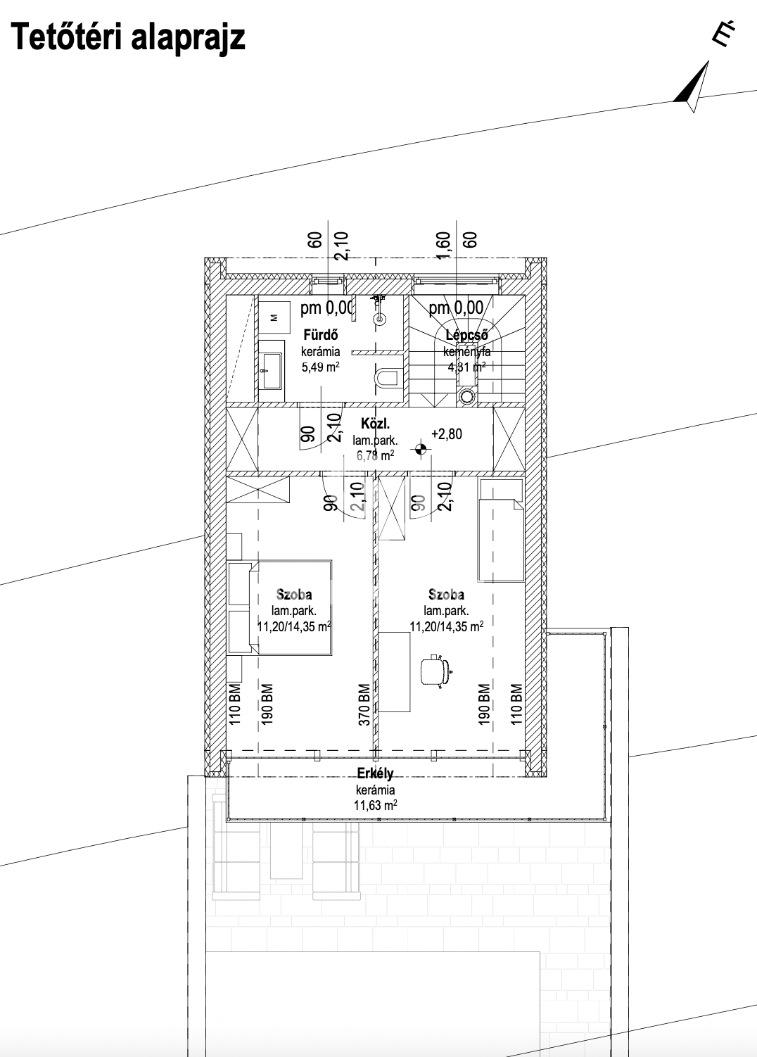 A tetőtérben nyitott fedélszéket terveztek. Nem lenne lezárva padlásfödémmel, hanem felmenne a belmagasság a taréjszelemenig. A nagy üvegfelület igazából csak így nézne ki jól, így a gerinc közelében a tetőtéri belmagasság 3,70 m lenne. Szép tágas és fényes!